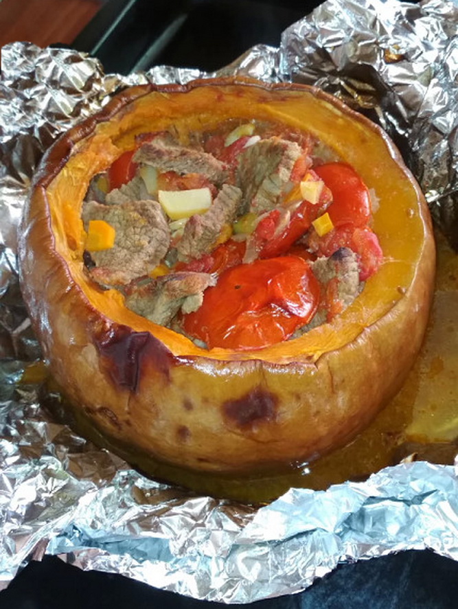Pronezka Опубликовано 26 сентября, 2018 Опубликовано 26 сентября, 2018 Pronezka, про фаршированную расскажите, пожалуйста, поподробнее, как готовили говядина – 400 г (любое мясо) тыква – 1 шт. (для горшочка) кабачок –1 шт (не крупный) морковь крупная – 2 шт. картофель – 2 шт. репчатый лук – 1 шт. чеснок – 3-4 зубчика помидоры – 2 шт. соль, перец по вкусу оливковое масло для жарки стебли сельдерея – по вкусу Тыкву, картофель и морковь, кабачок, лук и чеснок чистим, моем, обсушиваем. Мясо, кабачок, картофель и морковь нарезаем небольшими кусочками. Подготавливаем горшочек из тыквы, срезаем верх ( будет крышечкой). Вынимаем из неё семена и немного срезаем мякоть (мякоть нарезаем ). Далее ставим горшочек из тыквы, обернутый фольгой, но незапечатанный в разогретую до 180 градусов духовку на 10 минут. Тем временем обжариваем на оливковом масле мясо. Далее поочередно в сковороду добавляем сначала лук, затем морковь и картофель с тыквой и кабачком, стебли сельдерея по желанию. Солим и перчим по вкусу. Затем накрываем крышкой и тушим до полуготовности. В разогретый тыквенный горшочек перекладываем мясо с овощами, добавляем помидоры и чеснок, пряные травы по вкусу, накрываем крышечкой и запечатываем фольгой. Ставим горшочек из тыквы в духовку минут на 15-20 при температуре 200 градусов. 2