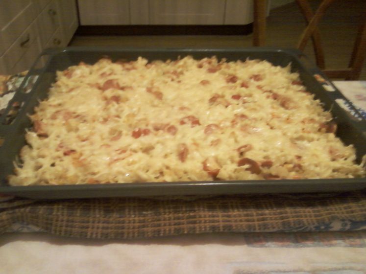 marusya Опубликовано 17 декабря, 2012 Опубликовано 17 декабря, 2012 макароны варёные (лучше вчерашние) перец болгарский кубиками помидоры черри сыр твердый кубиками - берем голладский Кез ветчина, в нашем случае - сливочные Кунгурские сосиски добавили кукурузу консервированную 3 яйца взбить + пару ложек майонеза = всю массу перемешать и в духовку Много не солите - сыр соленый Банальная запеканка из макарон - но очень вкусная! 1