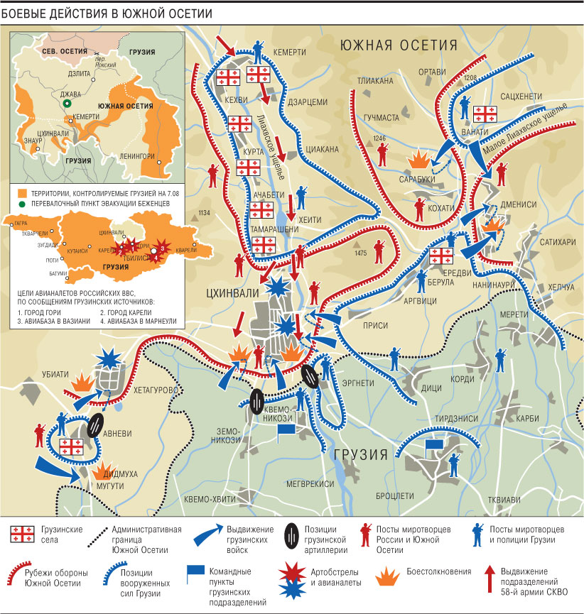 Оборотень Опубликовано 9 августа, 2008 Опубликовано 9 августа, 2008 Хроника: С 1 августа ежедневно сообщалось о перестрелках в зоне конфликта. Вечером 7 августа, после ряда ожесточенных столкновений, Михаил Саакашвили объявил об одностороннем прекращении огня и готовности начать переговоры. 23.30 по московскому времени 7 августа Грузия начала артобстрел Цхинвали, южноосетинские подразделения открыли ответный огонь. 1.40 8 августа Эдуард Кокойты заявил: "Идут ожесточенные бои, врагу наносится ощутимый урон". 2.30 Правительство Грузии сообщило о вынужденном отказе от прекращения огня, обвинив Южную Осетию в обстреле грузинских сел. 2.45 Командование миротворцев сообщило, что "Грузия объявила войну Южной Осетии". Начались бои на подступах к Цхинвали, в городе отключено электроснабжение. 2.50 Грузинские СМИ сообщили о "вытеснении" южноосетинских формирований из сел Дидмуха, Мугути и Дмениси. 3.18 Тбилиси призвал "сепаратистов прекратить вооруженные действия". Парламент Южной Осетии обратился с просьбой о помощи к России. 3.50 Премьер Южной Осетии Юрий Морозов заявил о "полном разрушении" села Хетагурово. 4.05 Россия потребовала экстренного созыва заседания Совета Безопасности ООН. 4.35 Тбилиси объявил о том, что захвачены "еще пять сел зоны конфликта", а Цхинвали "почти окружен". 5.12 Грузинские Су-25 нанесли удары по Южной Осетии. 6.35 В Тбилиси начался сбор резервистов. 6.50 Агентства сообщили, что артобстрел Цхинвали "возобновился с новой силой". Появились данные о 15 погибших мирных гражданах и попадании грузинских ракет в штаб российских миротворцев. 7.15 Агентства сообщили о затишье в Цхинвали. 8.41 Грузинское радио "Имеди" заявило о захвате Цхинвали. 9.30 Пресс-служба Кремля сообщила о проведении экстренного совещания под руководством Дмитрия Медведева. 9.40 Абхазия выдвинула армию в сторону Грузии. 9.45 Владимир Путин поднял вопрос о ситуации в Южной Осетии на встрече с премьером госсовета КНР Вэнь Цзябао. 10.00 СБ ООН провел заседание по Южной Осетии, но никаких решений принять не смог. 10.15 Грузинская телекомпания "Рустави-2" сообщила о вступлении в Цхинвали 600 грузинских военных, установлении контроля над 11 селами и обстреле города Гори тремя Су-24 ВВС России, один из которых был сбит. 11.00 Владимир Путин на встрече с президентом Казахстана Нурсултаном Назарбаевым заявил, что атаки Грузии "будут вызывать ответные действия". 11.03 Российские миротворцы сообщили об убитых и раненых в результате "прицельного огня" с грузинской стороны. 11.05 Эдуард Кокойты в поселке Джава встретился с президентом Северной Осетии Таймуразом Мамсуровым. 12.21 МИД РФ назвал "бредом" сообщения о сбитом российском самолете. 13.10 Пресс-служба Минобороны РФ сообщила: "Своих миротворцев и граждан РФ мы в обиду не дадим". 13.29 Минобороны Грузии заявило о начале ввода в Южную Осетию российской тяжелой военной техники. 14.28 Мэр Тбилиси объявил о захвате 70% Цхинвали и объявлении на три часа моратория на ведение огня. 14.54 Пресс-секретарь российского премьера рассказал, что Владимир Путин обсудил ситуацию на встрече с Джорджем Бушем. 15.00 Российские СМИ передали выступление Дмитрия Медведева на Совете безопасности: "Мы не допустим безнаказанной гибели наших соотечественников". 15.30 Командующий миротворцами Марат Кулахметов заявил, что Цхинвали практически уничтожен, а секретарь Совбеза Южной Осетии Александ