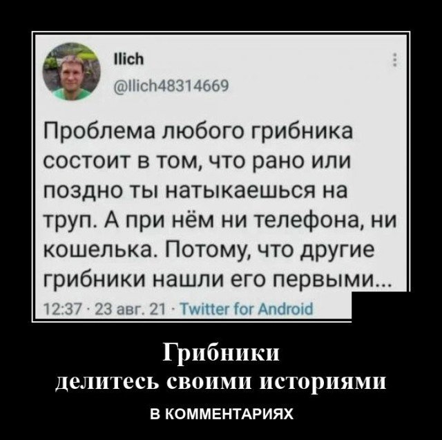 красная шапочка Опубликовано 22 августа, 2021 Опубликовано 22 августа, 2021 Что нужно делать в лесу, когда пошёл за грибами и нашёл гриб? Думаете достать ножичек, срезать и положить в корзинку? Ответ неверный. Нужно достать телефон, включить камеру, навести ее на гриб, и Яндекс скажет тебе можно ли брать этот гриб в корзинку или нет. Пипец!! какая я старомодная, я грибы без телефона собираю.
