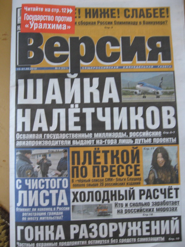 Газетку принесли, заботливые такие. В каждый ящичек сунули. "Версия" называется, московская. На первой страничке - наклейка, мол самое интересное на 12 странице. Статья "Государство разбирается с Уралхимом". В принципе ничего нового, + оказывается Д.Мазепин в стриптиз-клубы захаживает (молодец, какой!). Тираж 70600 экземпляров - видимо, специально для Березников...