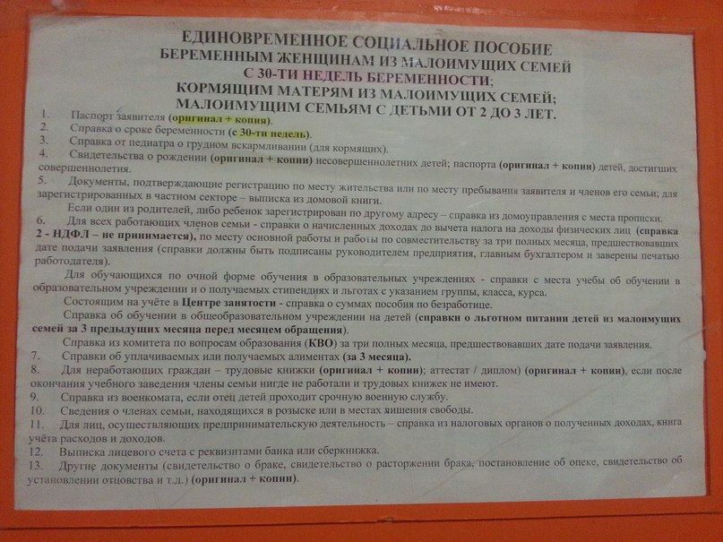 Кsения Опубликовано 5 июля, 2014 Опубликовано 5 июля, 2014 Девушки, а не работающей беременной в 30 нед полагаются какие-нить выплаты от соц защиты или только за роды? если есть статус малоимущей разовая выплата в 30 недель(единовременное пособие беременной малоимущей) и после родов также разовая выплата как (кормящей малоимущей) в 2012 было вроде 1800р. Могу в точности названии выплаты ошибаться. Для этого надо справку от гинекогога в первом случае и справку от педиатра во втором+ заявления на эти пособия. вот полный перечень документов,сама недавно оформляла выплату для кормящих матерей)