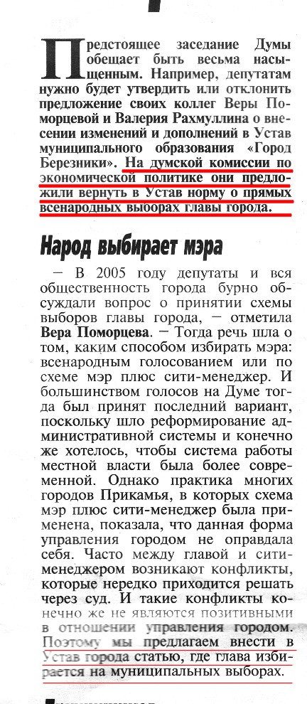 А тут вона как... Я аж удивился. Чей-то БХшники на попятную пошли...? С одной стороны вроде как бы хорошо... Поскольку и Уполномоченный по правам человека в Пермском крае ещё в 2005 году по нашей просьбе исследовала вопрос и дала заключение, что всенародные выборы мэра с точки зрения реализации права населения на местное самоуправление предпочтительнее.