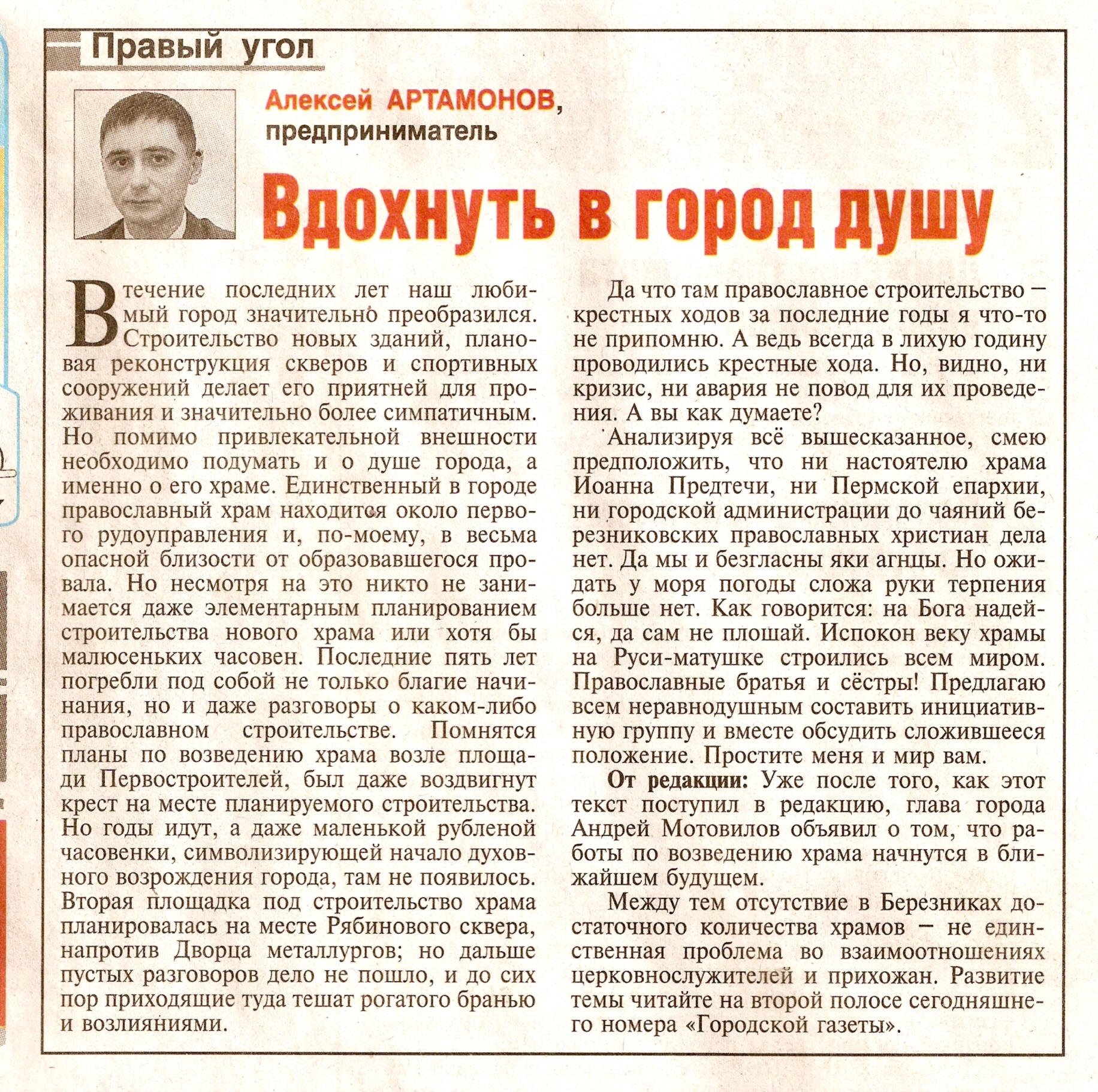 Артамонов Опубликовано 17 октября, 2009 Опубликовано 17 октября, 2009 2 Артамонов:К сожалению (счастью) я не выписываю и не покупаю местную прессу. Не могли бы вы выложить скан или непосредственно статью, чтоб можно было понять о чём собственно идёт перепалка (и может быть поучаствовать) :lol: . Спасибо. Вопрос по существу только один. Чего ж матерьяльчик-то появился в самый нужный момент? Далёк от кухни, но мне кажется это называется "заказуха". Прочтите, пожалуйста, статью и скажите, где я был не прав? Иль кому из политиканов воды на мельницу плеснул? А вовремя, это потому, что мной уже не в первый раз поднимается вопрос на православную тематику. До этого в "Березники вечерние" высказал своё мнение о таинствах и их оплате. Если интересно, отсканирую, вышлю. Очень рад такому количеству неравнодушных. :lol: