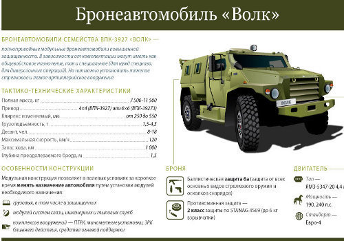 Master Yoda Опубликовано 3 ноября, 2011 Опубликовано 3 ноября, 2011 Новый отечественный бронеавтомобиль «Волк» "Отечественный бронеавтомобиль «Волк» — новая разработка российских инженеров. Этот автомобиль, один из первых бронеавтомобилей нашей страны, который собран исключительно из комплектующих частей Российского производства. А это означает независимость от поставок запасных частей иностранных производителей. На базе бронеавтомобиля «Волк» проектируются и создаются различные модификации для выполнения самых разнообразных боевых задач. В настоящее время создано четыре варианта этого бронеавтомобиля: * ВПК-3927 (первая базовая комплектация с раздельными защищенными модулем управления и функциональным модулем) * ВПК-39271 (с совмещенными в один модулями) * ВПК-39272 (транспортно-грузовой бронеавтомобиль для перемещения грузов и перевозки военнослужащих, с возможностью установки различных дополнительных модулей) * ВПК-39273 (как и первый вариант, с раздельными модулями управления и увеличенным грузовым модулем) Первые три варианта бронеавтомобиля имеют колёсную формулу 4х4, а последний образец 6х6. В зависимости от оснащения и комплектации автомобиль планируется использовать как для боевого применения, так и для гражданских целей, помимо вышеперечисленных бронированных вариантов в стадии разработки находятся не бронированные машины. Основной конструктивной особенностью нового бронеавтомобиля «Волк» является высокая унификация, что упрощает его изготовление и снижает общую стоимость серийного производства. На фоне ведущихся разговоров о том, принимать ли на вооружение российских спецподразделений пока еще не доработанный «Волк» или итальянский бронеавтомобиль аналогичного класса «IVECO», это немаловажный фактор. Все бронеавтомобили серии «Волк» имеют разнесенную, дифференцированную (усиленную в самых уязвимых и важных местах корпуса) броню, с возможностью монтажа дополнительных композитных навесных броневых пластин в полевых условиях силами экипажа. Многослойная броня способна выдержать попадание 7,62-мм пули с дистанции до 300 метров, защищает экипаж и размещенный в десантном модуле личный состав от огня всех видов ручного стрелкового оружия и от осколков мин и снарядов. Высокопрочное пуле стойкое стекло толщиной 68 мм, не создающее оптических искажений, выдерживает практически любое попадание из автоматического оружия. Особое внимание уделено противоминной защите бронеавтомобиля, это V-образное двойное днище машины (по заявлениям разработчиков машина выдержит подрыв до 4 кг взрывчатого вещества (ВВ) в тротиловом эквиваленте. Все это без малого вес ВВ 122-мм фугасного снаряда, что вызывает сомнения, учитывая вес бронемашины, который равен 7 тоннам, к примеру, БТР-80 весом более 13 тонн при подрыве на таком фугасе просто переворачивает, подбрасывая его в воздух), специальные подвесные кресла для экипажа и десанта. Что касается устанавливаемых кресел, то можно предположить, что они всё-таки будут зарубежного производства, так как российские образцы дороже. Конструкция бронекорпуса машины позволяет устанавливать помимо пулеметного вооружения также лёгкое артиллерийское либо зенитное. В качестве силовой установки на новом «Волке» установлен ярославский 190-сильный мотор ЯМЗ-534, по заверениям производителей, имеющий потен