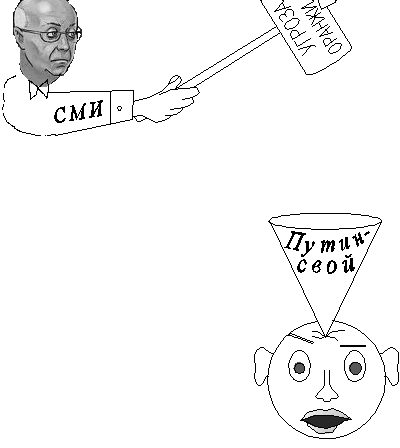 Бывает в жизни и так: понимаю, что человек в чем-то и прав, но я его не поддержу, потому, что его мысли и действия могут повлиять на мою дальнейшую судьбу. Или просто жизнь. Я, например, не буду голосовать за Зюганова, потому, что он за национализацию, а я не хочу потерять то не большое колличество акций, доставшееся мне при разгосударствлении предприятий. Загадку тоже хочу загадать: студент обучающийся за свой счет сможет не закончить ВУЗ в наше время? Думаю, нет, ну если только по собственному желанию, или не дай бог умрет. Отсюда и качество специалистов. Если не прав, внимательно выслушаю.