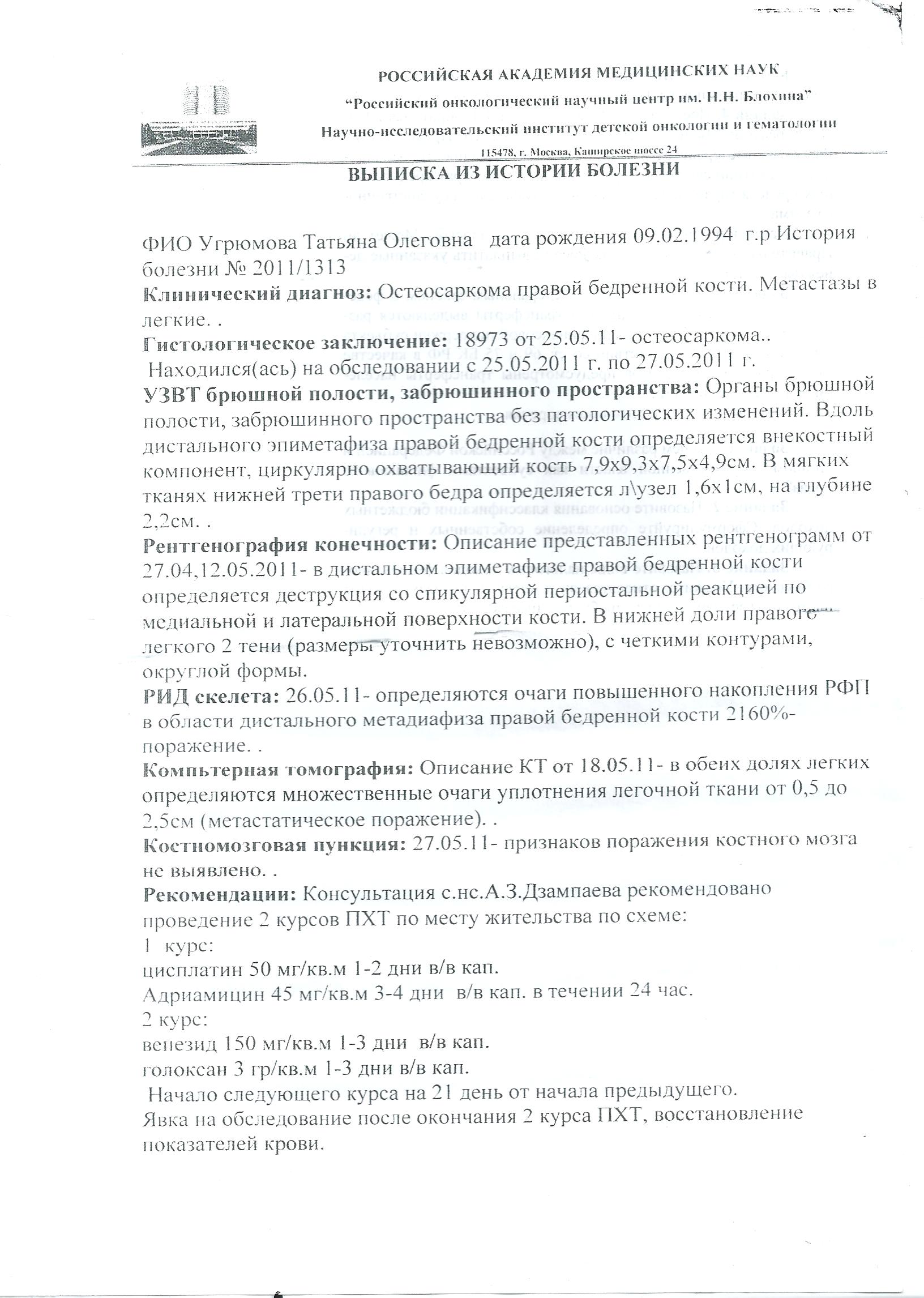 Угрюмова Татьяна Опубликовано 6 февраля, 2012 Опубликовано 6 февраля, 2012 Здравствуйте! Меня зовут Угрюмова Татьяна, мне 17 лет. Год назад я узнала что больна раком. Врачи поставили диагноз: САРКОМА БЕДРА С МНОЖЕСТВЕННЫМИ МЕТАСТАЗАМИ В ЛЁГКИЕ. В России нам с мамой сразу сказали:АМПУТАЦИЯ!!! Мне не хотелось в это верить. Ведь жизнь только началось, я ничего ещё не успела сделать, чего то достичь. Мама нашла в интернете клинику в Израиле. Мы отправили туда документы и нам сразу же ответили. Врачь сказал что ножку можно сохранить, только нужно быстрее приезжать. Мы собрали деньги для поездки и поехали в Израиль. Вот уже спустя 8 месяцев мы ещё лечимся. Мне сделали операцию по замене части кости, вырезали опухоль, поставили протез. И казалось бы всё позади, но лечение нужно продолжать ведь ещё метастазы. Деньги на исходе и сил уже нет. Лечение прерывать нельзя, осталось совсем чуть-чуть. Я уже прошла 12 курсов химиотерапии. Осталось ещё 5. Помогите пожалуйста, нужно собрать ещё 30 000 $. Я всегда мечтала стать пианисткой, помогите моей мечте сбыться!!!! Реквизиты для перечесления денег: СбербанкРоссии ОАО Кор/сч: 30101810500000000674 ИНН: 7707083893 БИК: 046577674 р/сч: 47422810416059940001 КПП: 663202001 № карты 4276 8160 2682 0967 лс 40817810016460011887 Получатель Угрюмова Татьяна Олеговна
