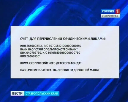 помогите маше Опубликовано 8 февраля, 2012 Опубликовано 8 февраля, 2012 Маше Задорожной сейчас два года. В возрасте семи месяцев ей поставили страшный диагноз: злокачественная опухоль мозга. Она перенесла тяжелую операцию, изнурительную химиотерапию. В настоящий момент нуждается в срочном лечении в протонном центре «Ринекер», который находится в Мюнхене (Германия). Заплатить за лечение нужно 60 тысяч евро. Для Машиных родителей это огромная сумма, неподъемные деньги. Чтобы помочь собрать их, Ставропольский краевой центр развития творчества детей и юношества провел благотворительную акцию под девизом «Помогите Маше встать на ноги, ощутить радость детства!». Состоялись благотворительный концерт, платные билеты на который распространяли воспитанники центра, и выставка-продажа изделий декоративно-прикладного искусства – за прилавком стояли сами авторы-изготовители этих игрушек, бижутерии и т. д. Акция прошла успешно. Зал на концерте был полон, зрители сидели даже на балконе. На сцене блистали самодеятельные творческие коллективы и солисты не только центра, но и всего города. Хорошо разошлась и продукция ярмарки-продажи. А еще присутствующие жертвовали деньги на лечение Маши здесь же, в зале. Например, родители одной из воспитанниц центра сдали 17 тысяч рублей. Всего во время акции удалось выручить и собрать около 180 тысяч рублей. Но требуется более двух миллионов… Мы просим любой помощи у посетителей сайта! Каждый рубль спасает жизнь девочки! Счёт для перечисления юридическим лицам: ИНН 2636002134, р/с 40703810100000000135, Банк ОАО «Ставропольпромстройбанк» БИК 040702760, к/с 3010181500000000760, КПП 263601001 Кому: СКО «Российского детского фонда» Назначение платежа: на лечение Задорожной Маши Также вы можете отправить смс на короткий номер 7878 с текстом "ребенок". С вашего счета автоматически спишутся 50 рублей, которые также пойдут на помощь ребенку. Акция пока действует только в сети "Билайн". Об участии в акции других операторов сотовой связи будет объявлено чуть позже.