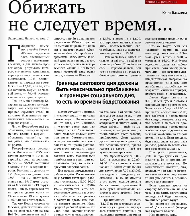 Вот это неправда. Публикации в газетах на эту тему собирают много откликов ( 2/3 за зимнее время, 1/3 за летнее ). Уже то, что этот вопрос так активно обсуждается, говорит о том, что - то здесь напутанно. Давайте разберёмся - полдень в Пскове в 14:23, а в Самаре в 12:40, благодаря нашему примьеру эти города находятся в одном часовом поясе. На месте жителя Самары, Ижевска, Кирова ничего менять не надо. Но кроме этих городов есть Оренбург, наша Пермь, Уфа где полдень в 14:20, Омск, Иркутск, Санкт - Петербург в 14:10, Чита - 14:28, Владивосток - 14:14, соответственно и светает в декабре в этих городах в 10:28 - 11:00.