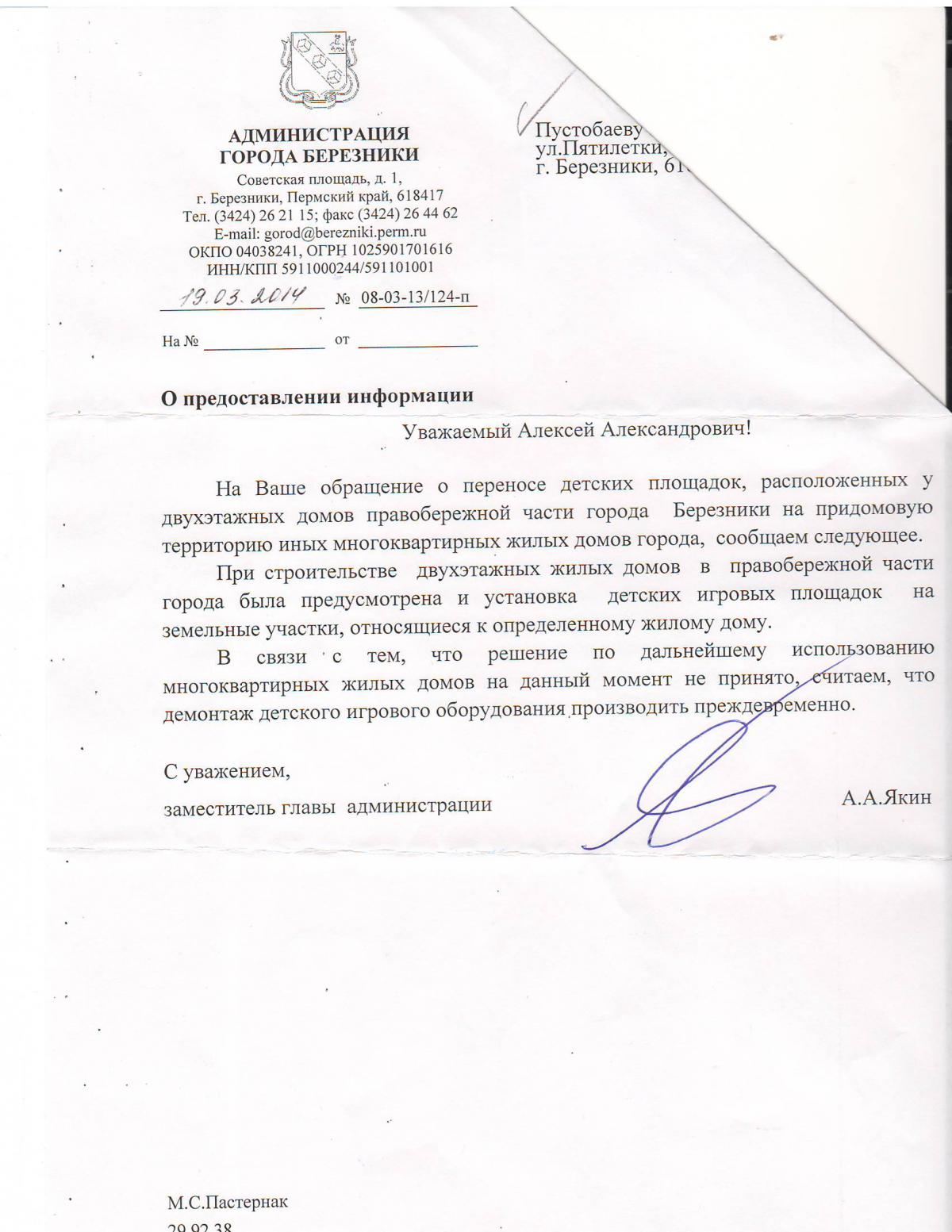 Алексей-- Опубликовано 28 марта, 2014 Опубликовано 28 марта, 2014 Не отдают детские площадки, попрошу в крае определиться побыстрее... Просил отдать площадки детские с территории формальдегидных домов в город, в частности к своему дому, указал, что расходы по переезду возьмем на себя. Отправил в край: Исходящий номер обращения REP73-73391152 Номер в ИСЭД Дата обращения) 2014-03-28 10:25:52 ФИО заявителя Социальное положение заявителя Другие категории граждан ФИО получателя Фролов Алексей Владимирович Должность получателя И.о.руководителя Администрации губернатора Пермского края Тема обращения Перенос детских площадок в г. Березники с территории незаселенных домов, построенных в Усольском мкр Текст обращения Добрый день, в связи с тем, что дома, построенные на деньги края в Усольском микрорайоне г. Березники признаны непригодными для проживания (превышение формальдегида) прошу разрешить перемещение детских площадок с территории этих домов на территорию многоквартирных домов в г. Березники. У нашего дома по ул. Пятилетки 39 в частности, и во многих других домах города, отсутствуют детские площадки, дети растут и им негде играть. При этом детские площадки в Усольском мкр. попросту простаивают, так как дома не заселены уже более 5 лет. Прошу решить вопрос в пользу детей.