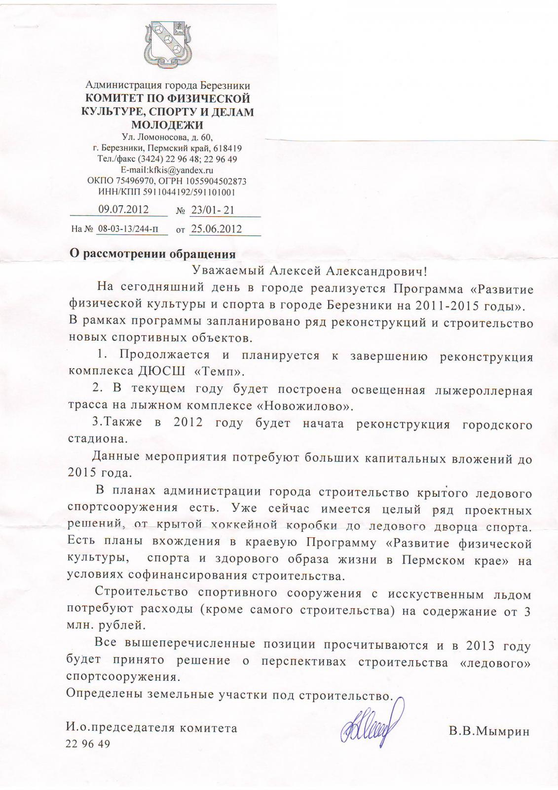 Алексей-- Опубликовано 25 июля, 2012 Опубликовано 25 июля, 2012 Ответ ко строительству крытого ледового сооружения (не всязано с обращением по поводу реконструкции парка, было подано раньше) Ответ не совсем устроил, так как сказано лишь о перспективах в 2013г., направлено обращение для ускорения процесса на сайт perm.ru Губернатору края.