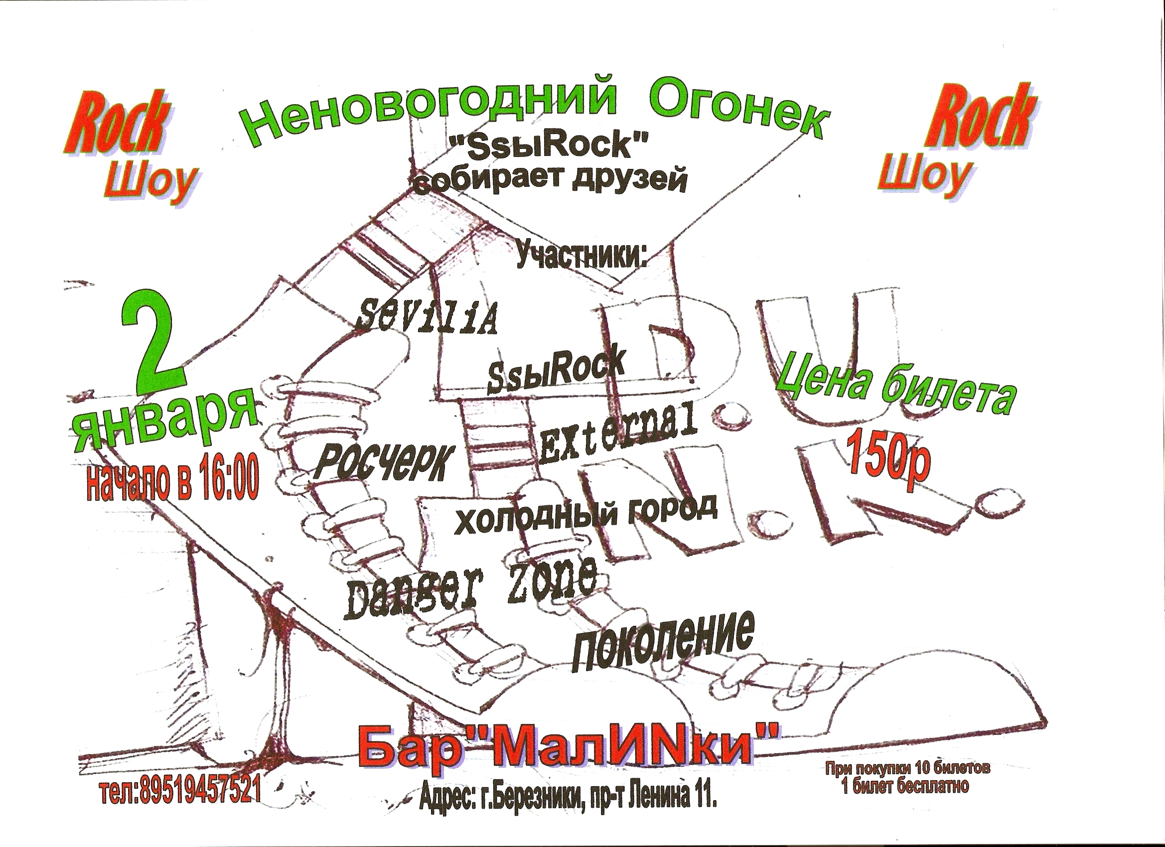 rolinc07 Опубликовано 23 декабря, 2008 Опубликовано 23 декабря, 2008 Rock Группа "SsыRock" представляет, Rock Шоу "Не новогодний огонек" Шоу будет проходить в 2 января в 16.00 бар МалИNки. Приглашаем всех желающих. Билет 150 rub. Участники: Sevilia, SsыRock, Росчерк, Холодный город, Externa, Поколение, Danger Zone. Тел. для справок: 89519457521, 25-72-75, 25-73-15 Кстати кто умеет танцевать брей к дан звонить по тел. 8 951 945 75 21
