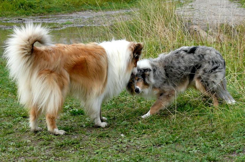 tatiana Опубликовано 6 сентября, 2011 Опубликовано 6 сентября, 2011 А наша Сандрюлька обожает кошек, всех, и своих и чужих, приходится иногда держать, чтобы не подходила к незнакомым. Самый большой друг у Сандры - белый кот Кузя, живущий в первом подъезде нашего дома. Кузя как только выходит из подъезда - руки в ноги - и бегом к нашему, радуется, если мы гуляем, и очень огорчается, если не находит своих друзей - Сандру и Тому