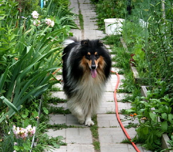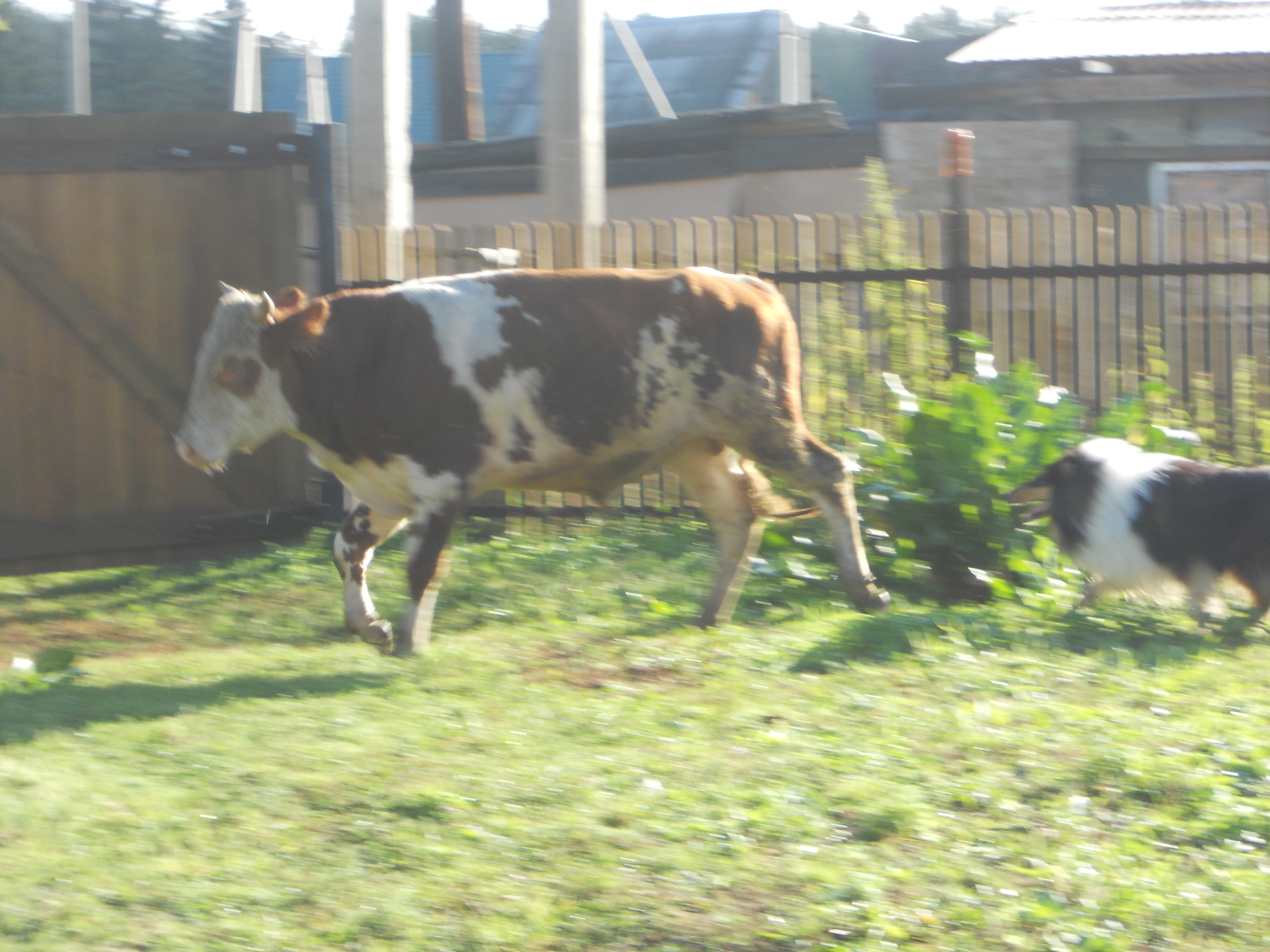 jene-lory Опубликовано 12 сентября, 2011 Опубликовано 12 сентября, 2011 У нас на даче в прошедшие выходные имело место такое приключение: приехали мы детьми и Лориком в субботу в деревню поздно, уже стемнело и начинался дождь. Открывая ворота, я уже предвкушала чашку чая перед камином, укрывшись теплым пледом и гладя в телевизор ;)). Когда распахнула ворота, я чуть не упала- на моей стриженной лужайке паслось стадо(!!!) коров, штук 20, с телятами и быками!!! Я была в шоке. Видимо где-то порвался старый забор и жвачные наслаждались моей морковкой и моими яблонями! Вначале я просто растерялась-ночь, дождь, дети за спиной....и собака! У меня же в конце концов пастушья собака! Вообще то до сих пор Лорику категорически запрещалось проявлять инициативу в отношении любых деревенских животных ( сорри, но местные жители за свою скотину могут и топором в собаку кинуть) Аккуратно вывела Лорика из машины, за ошейник обвела его по малине в тыл стада и сказала ему "Гони". Знаете, меньше минуты понадобилось собаке сообразить, что надо делать! Глупые жвачные не хотели вначале вставать, потом норовили разбежаться по углам и разнести остатки забора, потом одна из коров решила "побороться"за свое счастье и наклонив рога ринулась на нас! Лорд так ловко заставлял их подняться , покусывая за задние ноги, и при этом умудрялся разворачивать корову мордой в нужную сторону! Мы с Лордом собрали всех коров из углов участка и ровной колонной прогнали их в калитку шириной около 1 метра!!! Говорят пастуший инстинкт очень сильно передается по наследству. Поэтому если кто-то вдруг захочет использовать колли по своему природному назначению, может смело брать собаку вашего разведения! Проверено! Дыру в заборе утром мы нашли, но и еще пару раз за воскресенье несколько коров умудрялись забраться к нам огород ( пока мы ждали ремонта забора). Мы к тому времени уже совсем осмелели, и даже сделали фотки!