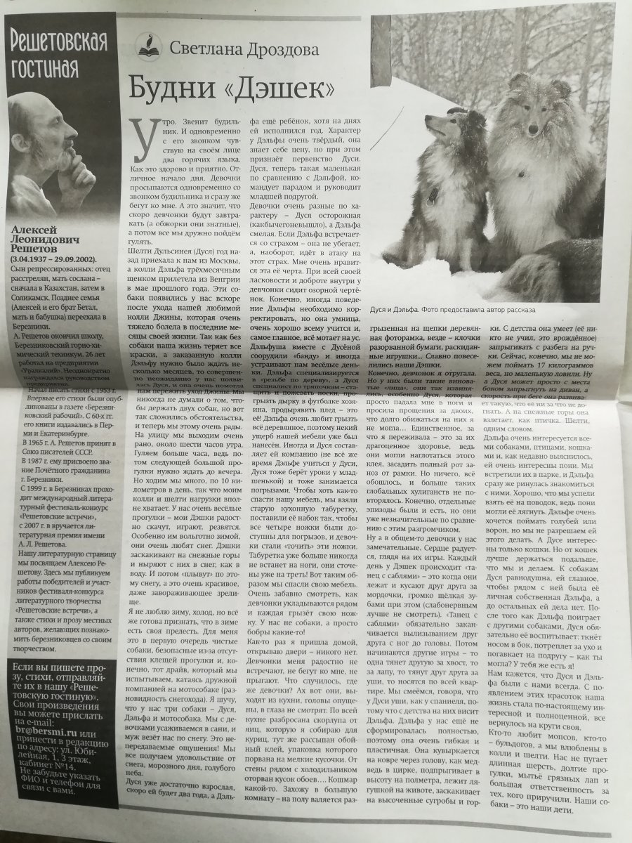 Светлана Дроздова Опубликовано 9 апреля, 2019 Опубликовано 9 апреля, 2019 В Березниковском вышел мой рассказ про моих попрыгушек. Будни «Дэшек» Утро. Звенит будильник. И одновременно с его звонком чувствую на своем лице два горячих языка. Как это здорово и приятно! Отличное начало дня! Девочки просыпаются одновременно со звонком будильника и сразу же бегут ко мне. А это значит, что скоро девчонки будут завтракать (а обжорки они знатные!), а потом все мы дружно пойдем гулять! Напомню, что шелти Дульсинея (Дуся) год назад приехала к нам из Москвы, а колли Дэльфа трехмесячным щенком прилетела из Венгрии в мае прошлого года. Эти собаки появились у нас вскоре после ухода нашей любимой колли Джины, которая очень тяжело болела в последние месяцы своей жизни. Так как без собаки наша жизнь теряет все краски, а заказанную колли Дэльфу нужно было ждать несколько месяцев, то совершенно неожиданно у нас появилась Дуся. Дуся очень помогла нам пережить уход Джины. Мы никогда не думали о том, чтобы держать двух собак, но вот так сложились обстоятельства, и теперь мы этому очень рады! На улицу мы выходим очень рано, около шести часов утра. Гуляем больше часа, ведь потом следующей большой прогулки нужно ждать до вечера. Но ходим мы много, по 10 километров в день, так что моим колли и шелти нагрузки вполне хватает. У нас очень веселые прогулки – мои Дэшки радостно скачут, играют, резвятся. Особенно им вольготно зимой, они очень любят снег. Дэшки заскакивают на снежные горы и ныряют с них в снег, как в воду. И потом «плывут» по этому снегу, а это очень красивое, даже завораживающее зрелище! Я не люблю зиму, холод, но все же готова признать, что в зиме есть своя прелесть! Для меня это в первую очередь чистые собаки, безопасные в плане отсутствия клещей прогулки и, конечно, тот драйв, который мы испытываем, катаясь дружной компанией на мотособаке (разновидность снегохода). Я шучу, что у нас три собаки – Дуся, Дэльфа и мотособака! Мы с девочками усаживаемся в сани, и муж везет нас по снегу! Это непередаваемые ощушения! Мы все получаем удовольствие от снега, морозного дня, голубого неба! Дуся уже достаточно взрослая, скоро ей будет два года, а Дэльфа еще ребенок, хотя на днях ей исполнился год. Характер у Дэльфы очень твердый, она знает себе цену, но при этом признает первенство Дуси. Дуся, теперь такая маленькая по сравнению с Дэльфой, командует парадом и руководит младшей подругой. Девочки очень разные по характеру – Дуся осторожная (какбычегоневышло), а Дэльфа смелая! Если Дэльфа встречается со страхом – она не убегает, а, наоборот, идет в атаку на этот страх. Мне очень нравится эта ее черта. При всей своей ласковости и доброте внутри у девчонки сидит озорной чертенок. Конечно, иногда поведение Дэльфы необходимо корректировать, но она умница, очень хорошо всему учится и, самое главное, все мотает на ус! Дэльфуша вместе с Дусёной соорудили «банду» и иногда устраивают нам веселые деньки. Дэльфа специализируется в «резьбе по дереву», а Дуся специалист по тряпочкам – стащить и пожевать носки, прогрызть дырку в футболке хозяина, продырявить плед – это её! Дэльфа очень любит грызть все деревянное, поэтому некий ущерб нашей мебели уже был нанесен! Иногда и Дуся составляет ей компанию (не все же время Дэльфе учиться у Дуси, Дуся тоже берет уроки у младшенькой!) и тоже занимается погрызами.