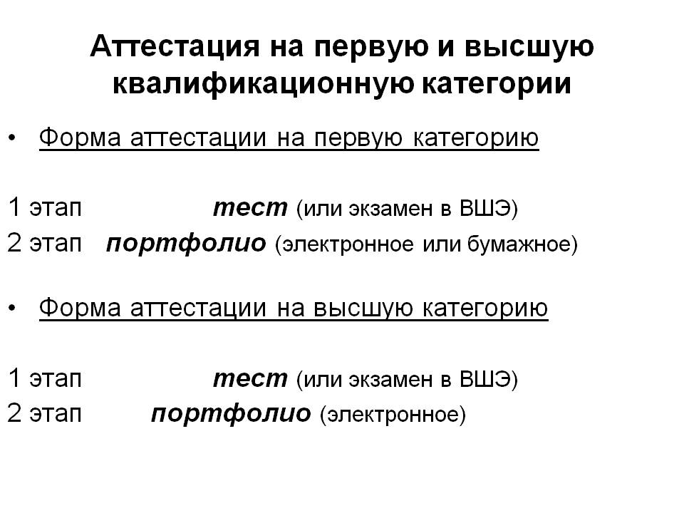 avz2 Опубликовано 31 мая, 2010 Опубликовано 31 мая, 2010 Нет там ни ВШЭ, ни этого скана. Читаем внимательно официальный документ: http://mon.gov.ru/dok/akt/7194/ III. Порядок аттестации педагогических работников с целью подтверждения соответствия занимаемой должности 19. Основанием для проведения аттестации является представление работодателя (далее - представление). 20. Представление должно содержать мотивированную всестороннюю и объективную оценку профессиональных, деловых качеств педагогического работника, результатов его профессиональной деятельности на основе квалификационной характеристики по занимаемой должности, информацию о прохождении педагогическим работником повышения квалификации, в том числе по направлению работодателя, за период, предшествующий аттестации, сведения о результатах предыдущих аттестаций. С представлением педагогический работник должен быть ознакомлен работодателем под роспись не позднее чем за месяц до дня проведения аттестации. После ознакомления с представлением педагогический работник имеет право представить в аттестационную комиссию собственные сведения, характеризующие его трудовую деятельность за период с даты предыдущей аттестации (при первичной аттестации - с даты поступления на работу), а также заявление с соответствующим обоснованием в случае несогласия с представлением работодателя. IV. Порядок аттестации педагогических работников для установления соответствия уровня их квалификации требованиям, предъявляемым к квалификационным категориям (первой или высшей) 25. Аттестация педагогического работника для установления соответствия уровня его квалификации требованиям, предъявляемым к первой или высшей квалификационным категориям, проводится на основании заявления педагогического работника. 30. Первая квалификационная категория может быть установлена педагогическим работникам, которые: владеют современными образовательными технологиями и методиками и эффективно применяют их в практической профессиональной деятельности; вносят личный вклад в повышение качества образования на основе совершенствования методов обучения и воспитания; имеют стабильные результаты освоения обучающимися, воспитанниками образовательных программ и показатели динамики их достижений выше средних в субъекте Российской Федерации. 31. Высшая квалификационная категория может быть установлена педагогическим работникам, которые: имеют установленную первую квалификационную категорию; владеют современными образовательными технологиями и методиками и эффективно применяют их в практической профессиональной деятельности; имеют стабильные результаты освоения обучающимися, воспитанниками образовательных программ и показатели динамики их достижений выше средних в субъекте Российской Федерации, в том числе с учетом результатов участия обучающихся и воспитанников во всероссийских, международных олимпиадах, конкурсах, соревнованиях; вносят личный вклад в повышение качества образования на основе совершенствования методов обучения и воспитания, инновационной деятельности, в освоение новых образовательных технологий и активно распространяют собственный опыт в области повышения качества образования и воспитания. Остальное - самодеятельность местной образовательной власти. Незачем приписывать доку
