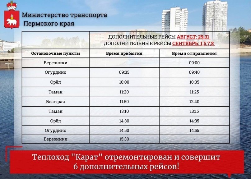 Biz Опубликовано 6 мая, 2024 Опубликовано 6 мая, 2024 С 15 мая 2024 г. открывается навигация по маршруту «Березники-Быстрая-Березники» | Теплоход «Карат» Расписание движения теплохода «Карат» и тарифы по маршруту «Березники-Быстрая-Березники» перевозчик ООО «Мошево». Среда, Суббота — отправление из Березников в 09:00; отправление из д. Быстрая в 12:40. Воскресенье — отправление из Березников в 14:00; отправление из д. Быстрая в 17:20. Стоимость билета на весь маршрут составляет 193 рублей. Место отправления и прибытия в город Березники – пром. канал у п. Чкалово (в районе стоянки судов ИП Поликша М.А. (бывшая стоянка судов ПАО «Уралкалий»)), остановка «Лодочная база». Министерство транспорта Пермского края 2
