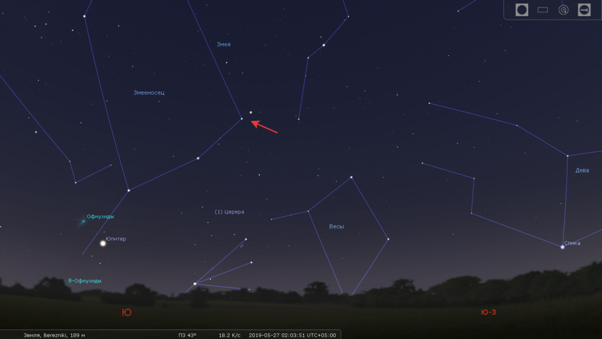 Fomalhaut Опубликовано 27 мая, 2019 Опубликовано 27 мая, 2019 30 минут назад, jimm031 сказал(а) : да-да. почитай статью на хабре почитал посмотрел... там ещё в комментах видео с Ирбитской камеры выложили. Звёздочки на том видосе в самом начале смог отыскать в Стеллариуме - это часть созвездий Змееносца (две яркий в центре кадра) и Весов (справа в низу) В принципе, теперь более понятен разброс траекторий поезда и его примерные габариты. Сделал ещё общий скрин со стрелочкой. Это примерные масштабы поезда и направление. Неудивительно, что он не попал в кадр моей трансляции, хотя народ до сих пор продолжает скидывать в комменты тайминги пролёта или чего они там видят 1