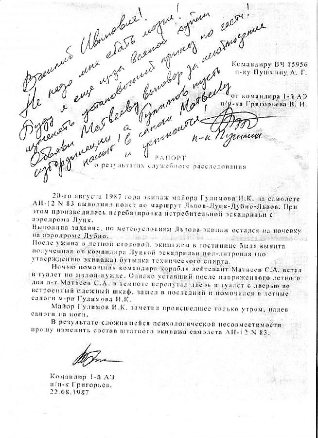 RomanIzrailevich Опубликовано 26 ноября, 2016 Опубликовано 26 ноября, 2016 тут у вас пятница была)) (бородатость))) про летчиков)) Командиру ВЧ 15956 п-ку Пушмину А.Г. от командира 1-й АЭ п/п-ка Григорьева В.И. РАПОРТ о результатах служебного расследования 20-го августа 1987 года экипаж майора Гулимова И.К. на самолете АН-12 № 83 выполнял полет по маршруту Львов-Луцк-Дубно-Львов. При этом производилась перебазировка истребительной авиации с аэродрома Луцк. Выполнив задание, по метеоусловиям Львова экипаж остался на ночевку на аэродроме Дубно. После ужина в летной столовой, экипажем в гостинице была выпита полученная от командира Луцкой эскадрильи пол-литровая (по утверждению экипажа) бутылка технического спирта. Ночью помощник командира корабля лейтенант Матвеев С.А, встал в туалет по малой нужде. Однако уставший после напряженного летного дня л-т Матвеев С.А, в темноте перепутал дверь в туалет с дверью во встроенный одежный шкаф, зашел в последний и помочился в летные сапоги м-ра Гулимова И.К, Майор Гулимов И.К. заметил происшедшее только утром, надев сапоги на ноги. В результате сложившейся психологической несовместимости прошу изменить состав штатного экипажа самолета АН-12 №83. Командир 1-й АЭ п/п-к Григорьев. 22.08.1987 РЕЗОЛЮЦИЯ НА РАПОРТЕ: Виталий Иванович! Не надо мне ебать мозги! Буду я еще из-за всякой хуйни изменять установочный приказ по части! Объяви Матвееву выговор за несоблюдение субординации, а Гулимов пусть нассыт в сапоги Матвееву и успокоится! п-к Пушмин 2