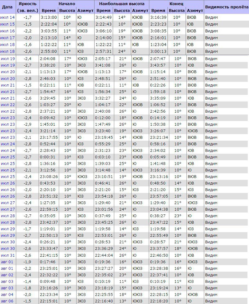 AMOS Опубликовано 30 июня, 2017 Опубликовано 30 июня, 2017 (изменено) Международную космическую станцию можно будет наблюдать находясь в Пермском крае. Высота полёта 350 - 400 километров. Любой желающий сможет её разглядеть на ночном небе, станция быстро передвигается с запада на восток, в период с 14 июля по 6 августа. Наблюдать МКС лучше всего за городом на возвышенности. Там значительно меньше освещения, поэтому небо не " засвечивается " и объект хорошо виден. Для того. чтобы увидеть крылья станции и крупные модули, достаточно будет вооружиться биноклем. Дана таблица - точная траектория пролёта МКС привязка для наблюдателей из Пермского края. Дан угол и время восхождения, угол максимального возвышения над горизонтом, угол и время захода. Для Пермского края ЮГ - 56 градусов В. Д. Ничего сложного в таблице нет. Изменено 1 июля, 2017 пользователем SAVATEY