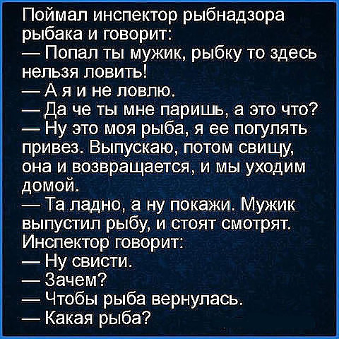 Иваныч Опубликовано 16 сентября, 2015 Опубликовано 16 сентября, 2015 Маленький сын вбегает в комнату к маме и горько плачет. Мама: — Сына, почему ты плачешь??? Сын, сквозь слезы: — Мы с папой были на рыбалке, папа поймал большую рыбу, а когда вытягивал удочку, леска оборвалась, и рыба уплыла. Мама, улыбаясь: — Ну, так а что тут плакать, сына?! Ты уже взрослый мальчик и должен понимать, что в таких ситуациях надо не плакать, а смеяться! — Так я и засмеялся…