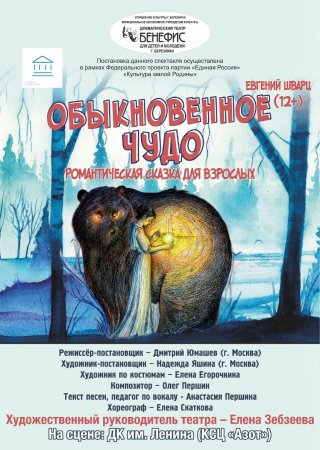 "Драматический театр "Бенефис" для детей и молодёжи" На сцене КСЦ "Азот" (ДК им. Ленина) Премьера спектакля! "Обыкновенное чудо" (12+) - романтическая сказка для взрослых На сцене «Бенефиса» «Обыкновенное чудо» действительно сумеет совершить нечто удивительное. Взрослые зрители ненадолго забудут бессмертную экранизацию Марка Захарова и испытают новые, чистые эмоции от знакомой пьесы. Подросткам спектакль поможет услышать слова, которые они таят в своей душе и которым боятся дать волю. Романтичным натурам - покажет нежную историю о любви и яркую, добрую сказку, а также поможет поверить в чудеса. Телефон: 8 (3424) 209 206 касса 8 902 47 37 040 - администратор Все молодые люди, кто уже получил Пушкинскую карту могут приобрести билет онлайн на сайте театра «Бенефис», а также в группе театра «ВКонтакте». Достаточно пройти по ссылке! 25 сентября, среда – начало в 15.00 https://quicktickets.ru/berezniki-teatr-benefis/s171 26 сентября, четверг – начало 15.00 https://quicktickets.ru/berezniki-teatr-benefis/s172